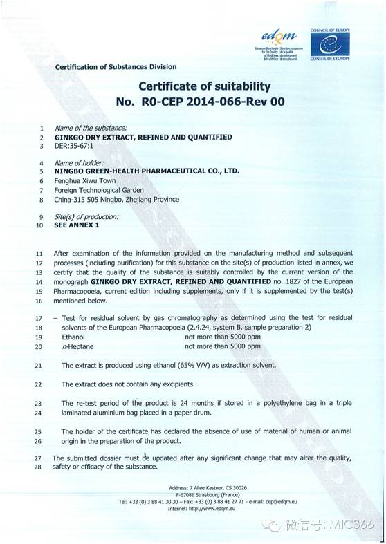 寧波綠之健藥業有限公司堅持“人無我有,人有我優”的經營理念和高質量、高效率的先進管理理念。綠之健品質堅守20年,實行產學研結合,其“銀杏葉提取物”關鍵技術指標,打破國外技術壟斷,率先達到國際先進水平,通過中國GMP認證、歐盟CEP認證及美國NSF認證,質量指標遠高于中國藥典標準, 截止2015年6月95%的產品遠銷美國、德國、法國、波蘭等。經歐洲知名藥企評價認為綠之健生產的銀杏葉提取物質量穩定、均一、純度高,有效提高了制劑品質。