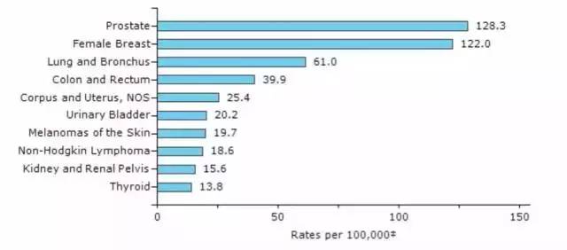 癌癥是美國死亡率第二高的疾病。不過事實上并不像我們小時候看的電視劇一樣,一得癌癥就必死無疑,并不是所有癌癥都等于直接判死刑。癌癥(cancer)這個詞源于希臘語,在希臘語中是“螃蟹”的意思,因為某些腫瘤中的肉和血管膨脹扭曲看起來很像橫行的螃蟹,所以被稱為cancer,這簡單的一個詞代表著100多種不同的癌癥。上圖來自美國疾病控制中心,展示了患病率最高的癌癥,他們分別是前列腺癌、乳房癌、肺和支氣管癌、結(jié)腸和直腸癌子宮癌、尿道和膀胱癌、黑色素皮膚癌、非何杰金氏淋巴瘤、腎癌、甲狀腺癌。病因可能是遺傳,也可能是不良的生活習慣——如吸煙、節(jié)食、太陽暴曬等。