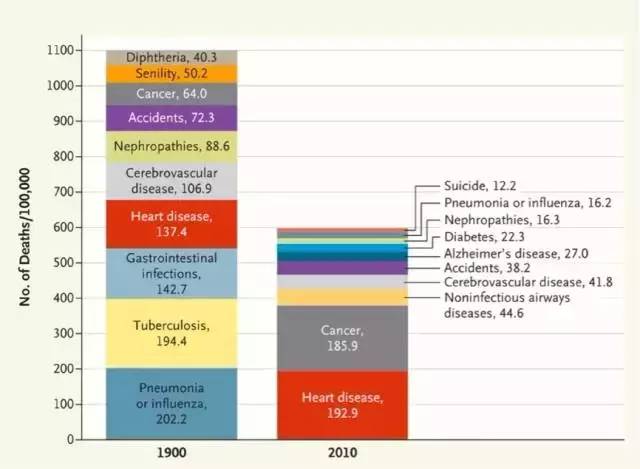 《新英格蘭醫(yī)學雜志》對上個世紀美國人的死亡原因進行了分析,發(fā)現(xiàn)了一個變化。隨著醫(yī)藥學的發(fā)展,人們對疾病理論理解的深入,死于傳染病病原體(如肺結(jié)核和肺炎)的人越來越少。更多的人死于例如癌癥、心臟病和其他由于年老身體各部分節(jié)能衰弱(阿爾茨海默癥等)而引發(fā)的慢性疾病。