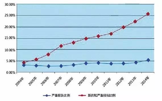 其中,中藥注射劑依然值得關注:2014年全國藥品不良反應監測網絡共收到中藥注射劑報告12.7萬例次,其中嚴重報告占6.7%。與2013年相比,中藥注射劑報告數量增長5.3%,高于總體報告增長率;嚴重報告數量增長26.0%,與總體嚴重報告增長情況基本一致。