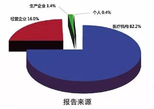 統計分析顯示,醫療機構仍是不良反應報告的主要來源,占報告數量的82.2%,藥品經營企業的報告占16.0%,藥品生產企業的報告占1.4%,個人及其他來源的報告占0.4%。與2013年相比,醫療機構報告增長明顯,藥品生產企業報告比例與既往持平,經營企業報告比例繼續下降。