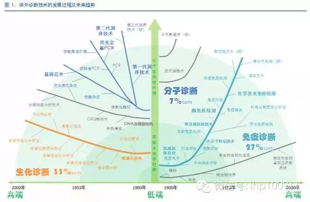 分子診斷是應用分子生物學方法檢測患者體內(nèi)遺傳物質(zhì)的結(jié)構(gòu)或表達水平的變化而做出診斷的技術(shù),其核心是基因診斷技術(shù)。分子診斷因其量化特征,在精度上較傳統(tǒng)生化與免疫診斷高,是診斷市場的高新技術(shù)。