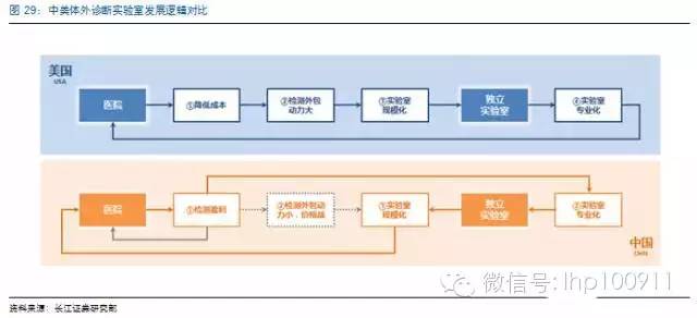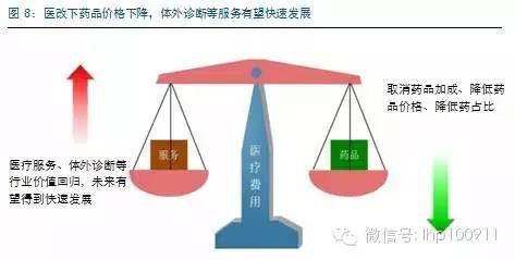 另一方面,計劃經(jīng)濟時代醫(yī)院遺留下的15%的藥品加成收入將在醫(yī)改過程中逐步取消。而醫(yī)院作為一個經(jīng)濟體,未來會將更多注意力投入醫(yī)療服務(wù)或診斷科室,以彌補其藥品收入下降的損失?!爸厮幤?,輕服務(wù)”現(xiàn)狀將逐步得到糾正,醫(yī)療服務(wù)及體外診斷將在此消彼長中得到快速發(fā)展。
