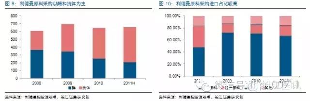 由于生產(chǎn)工藝、產(chǎn)物純度等因素影響,國產(chǎn)原料離生產(chǎn)要求仍存在一定差距,目前診斷酶、抗體等主要原料仍依賴國外進口。以2011年上市的利德曼為例,2008年-2011年中進口原料成本費用均在總成本50%以上,其中2011年進口原料成本占比67.19%??紤]到利德曼是少數(shù)原料研發(fā)上有較多突破的公司,我們預計全國原料平均進口成本占比在70%以上。