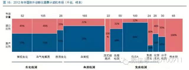 試劑方面,高端市場仍以進口產(chǎn)品為主。從2012年國內(nèi)體外診斷試劑細分行業(yè)來看。低端的生化國產(chǎn)試劑已逐步超過進口試劑,如血氣電解質(zhì)、尿液生化檢測等領(lǐng)域市場份額均已超過60%。免疫檢測雖然在酶聯(lián)免疫方面取得一定的突破,但高端的化學放光檢測依舊為外資企業(yè)所壟斷,2012年市占率僅為18%。分子診斷方面由于對原料要求相對較低,國內(nèi)試劑發(fā)展較為迅速,2012年市占率達到72%。此外血液檢測的流式細胞術(shù)及微生物檢測方面,國內(nèi)進展較為緩慢,大部分診斷試劑仍需進口。