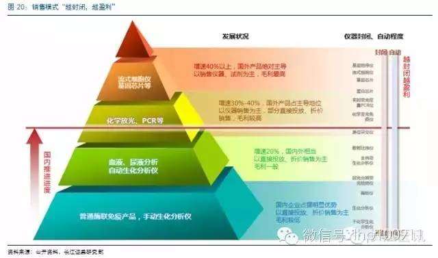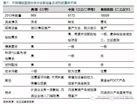 高端醫(yī)院重技術(shù),低級醫(yī)院重成本,中級醫(yī)院是國產(chǎn)品牌理想客戶。高端三甲醫(yī)院由于外資產(chǎn)品的先入為主,加之對科研和設(shè)備品牌的追求,更有意愿使用高通量、全自動的進口產(chǎn)品或高端檢測方法,此外較高的門診量,病人經(jīng)濟承受力也足以支撐高端設(shè)備的運作。而基層醫(yī)院由于經(jīng)費和病人數(shù)目有限,難以形成規(guī)模效應,對高通量的新檢測技術(shù)需求并不大。