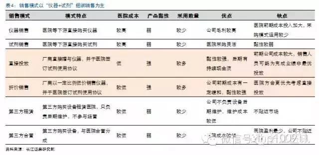 銷售模式以“儀器+試劑”捆綁銷售為主。體外診斷設(shè)備或試劑的銷售模式主要有儀器或試劑的直接銷售、直接投放、折價銷售、第三方租賃與第三方合營等模式。其中直接投放最為普遍,廠商免費贈與設(shè)備并合同約定在未來的一段時間內(nèi)需購買其對應試劑。這種營銷模式在一定程度上保證了客戶黏性,但在實際操作過程中往往由于銷售人員為完成業(yè)績而非最優(yōu)投放而有較大的損失。折價銷售在一定程度上避免了此類問題的出現(xiàn),但作為下游醫(yī)院方會優(yōu)先考慮直接投放模式。因此實際過程中兩種銷售模式各有所長,主要看看廠商與醫(yī)院方的議價能力與技術(shù)先進程度等。