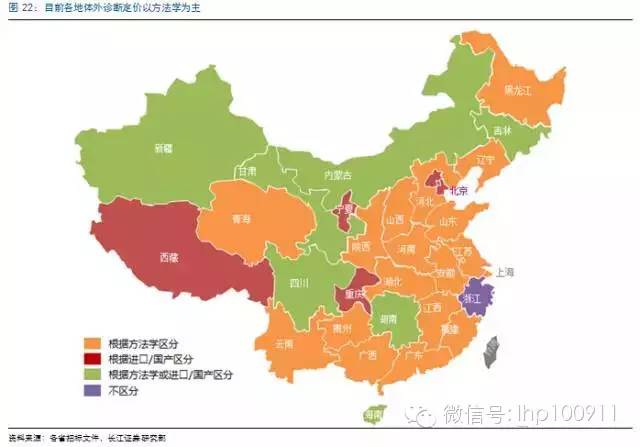 原有的定價方式大體分為按方法學、按進口國產(chǎn)區(qū)分、兩種方法的混用等以對方法不做不同的定價。目前近1/2省、市、自治區(qū)、直轄市采用方法學進行定價,主要集中于華東、華南、黑龍江等地。而近1/3采取方法學或進口/國產(chǎn)混用,主要集中于中部及北部地區(qū),在這些地區(qū)兩種方法都有所使用。截至2014年,僅浙江省采取不分方法學定價。