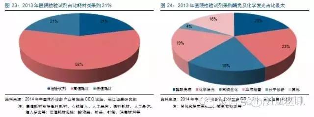 下游醫(yī)院市場是體外診斷市場的主要消費終端之一。2013年國內(nèi)醫(yī)院檢驗試劑采購總額約45億美元,占醫(yī)院耗材類采購總量21%,預計占全國體外診斷試劑使用量九成以上;其中化學發(fā)光與酶聯(lián)免疫試劑占比最高,分別占試劑使用量的23%、20%,血液監(jiān)測占比19%,常規(guī)生化18%,分子診斷4%。