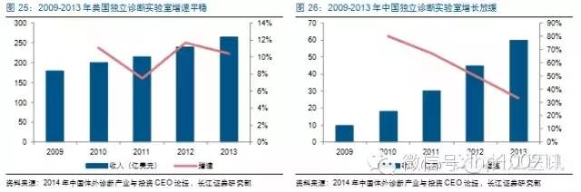增速相對放緩。獨立診斷實驗室(ICL)近些年發(fā)展迅速,已成為IVD下游需求的主要消費渠道之一。2013年國內(nèi)體外診斷實驗室收入約60億元,4年CAGR56.5%,雖然經(jīng)歷行業(yè)前期的高速增長后增速有逐步回落,但2013年33%的同比增長率也遠高于美國同期。