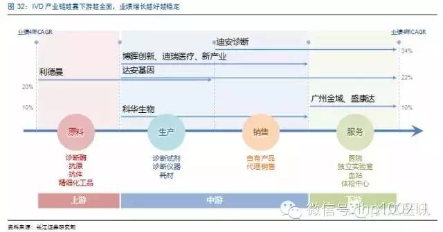 比較行業(yè)內(nèi)主要的幾家公司產(chǎn)業(yè)鏈布局和利潤增長情況也可發(fā)現(xiàn),產(chǎn)業(yè)鏈越齊全越靠下游,業(yè)績越好越穩(wěn)定。迪安診斷深耕華東第三方獨立診斷試驗室市場,業(yè)績增長迅速,潛力巨大。達安基因布作為分子診斷龍頭,以中山大學醫(yī)學體系為依托,獨立診斷實驗室為平臺,布局產(chǎn)業(yè)鏈生產(chǎn)、銷售、服務(wù)領(lǐng)域。而廣州金域、利德曼等公司布局產(chǎn)業(yè)鏈較短則同期增速在10%左右,目前利德曼正不斷加大上游原料研發(fā)力度并升級原有生化診斷產(chǎn)品,未來有獲得產(chǎn)業(yè)鏈協(xié)同收益。