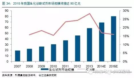 2010年,我國生化診斷試劑市場規(guī)模約為31.58 億元,我們預計,2015年我國生化試劑市場規(guī)模將接近80億元,CAGR將達到15%左右。