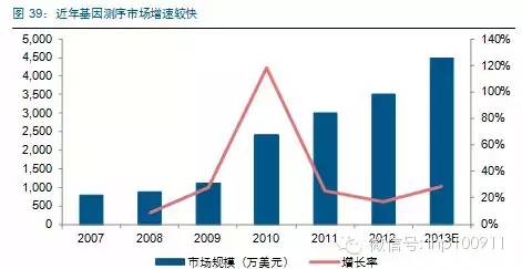 DNA測序技術(shù)共經(jīng)歷了三代,自第二代誕生后,基因測序產(chǎn)業(yè)發(fā)展提速,全球基因測序市場容量從2007年的794.1萬美元增至2013年的45億美元,6年CAGR為33.52%。隨著技術(shù)的推廣與設(shè)備的普及,預計未來幾年全球市場仍將繼續(xù)保持高速增長。