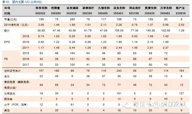 目前國內(nèi)市場主要上市公司標的有傳統(tǒng)龍頭企業(yè)科華生物、利德曼、達安基因;近期上市的如迪瑞醫(yī)療、九強生物、邁克生物、潤達醫(yī)療、美康生物等。其中達安基因、美康生物擁有第三方獨立診斷實驗室,邁克生物化學放光領(lǐng)域優(yōu)勢明顯,萬孚生物則在POCT方面有較大優(yōu)勢。