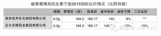 先聲和正大天晴兩個比阿培南在浙江備案的零售價是一樣的,因為比阿培南廠家少,先聲在省標(biāo)時報了一個謹(jǐn)慎的價格,較批發(fā)價來說僅降了9個點,正大天晴則降了12個點,前天寧波二次議價結(jié)果出來如何呢?據(jù)說在此基礎(chǔ)上又降了15個點,但仍然出局了!
