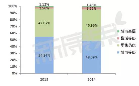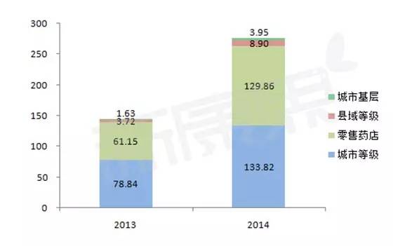 從各大終端來看,城市等級醫(yī)院DPP-4抑制劑的銷售規(guī)模占整個市場近一半,2013年和2014年分別為0.79億元和1.34億元。盡管規(guī)模大幅增加,但占比下降明顯。其次為零售藥店,占比從2013年的42.07%擴大為2014年的46.96%,而縣域等級醫(yī)院、城市基層醫(yī)院和農村基層醫(yī)院的總體占比僅為13%左右,但增長趨勢明顯。