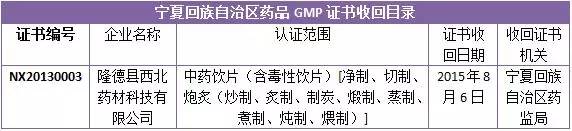 寧夏回族自治區(qū)藥監(jiān)局昨日發(fā)布2015年第1號收回藥品GMP證書公告,隆德縣西北藥材科技有限公司嚴重違反《藥品生產(chǎn)質(zhì)量管理規(guī)范》規(guī)定,依據(jù)《藥品生產(chǎn)質(zhì)量管理規(guī)范認證管理辦法》第三十三條規(guī)定,我局依法收回其中藥飲片《藥品GMP證書》。