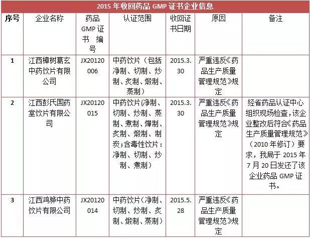 此外,經(jīng)省藥品認證中心組織現(xiàn)場檢查,江西彭氏國藥堂中藥飲片有限公司整改后符合《藥品生產(chǎn)質(zhì)量管理規(guī)范》(2010年修訂)要求,我局于2015年7月20日發(fā)還了該企業(yè)藥品GMP證書。