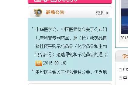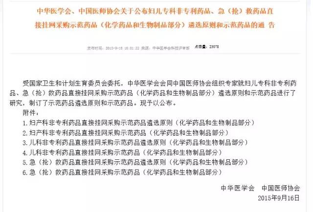 昨日下午4時,中華醫學會官網悄然上架一條公告:中華醫學會、中國醫師協會關于公布婦兒專科非專利藥品、急(搶)救藥品直接掛網采購示范藥品(化學藥品和生物制品部分)遴選原則和示范藥品的通 告