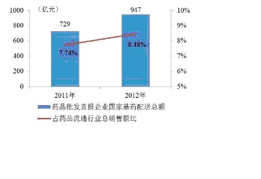 根據商務部統計數據顯示,2012年國家基本藥物銷售增幅較快,參與國家基本藥物配送的藥品批發直報企業國家基藥配送總額達到947億元,2011年增長23%;占藥品流通行業總銷售額比重約為8.48%,2011年增長74個百分點。