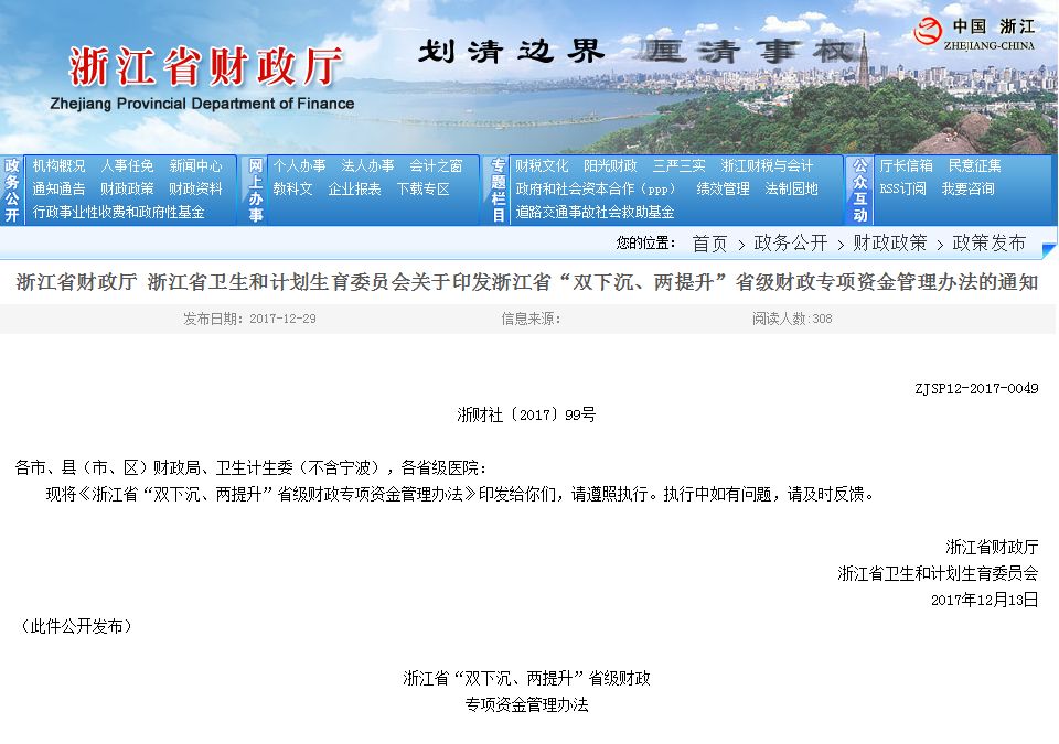 近日,浙江省財政廳、省衛生計生委印發《浙江省“雙下沉、兩提升”省級財政專項資金管理辦法》(以下簡稱《辦法》),省財政將設立“雙下沉、兩提升”省級財政專項資金(以下簡稱“雙下沉專項資金”),用于支持全省城市三甲醫院優質醫療資源下沉和提升各級醫院醫療衛生服務能力。此做法,在全國范圍內尚屬首例。