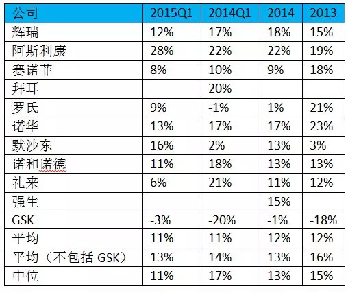2015年第1季度制藥巨頭在華/新興市場銷售額增長情況