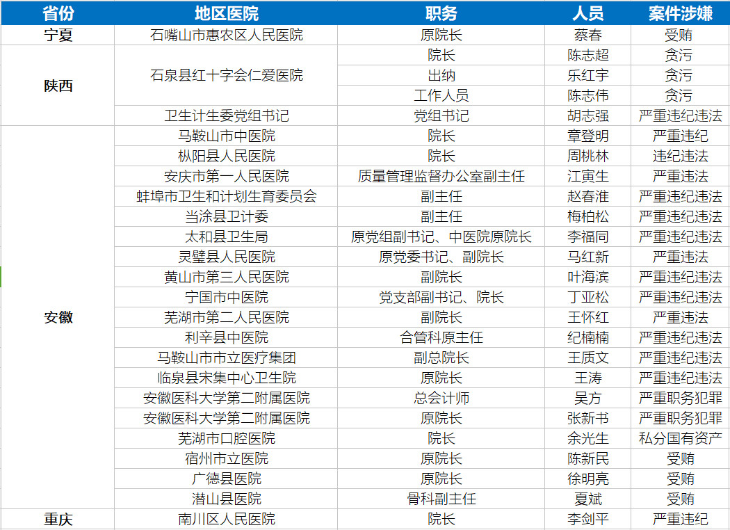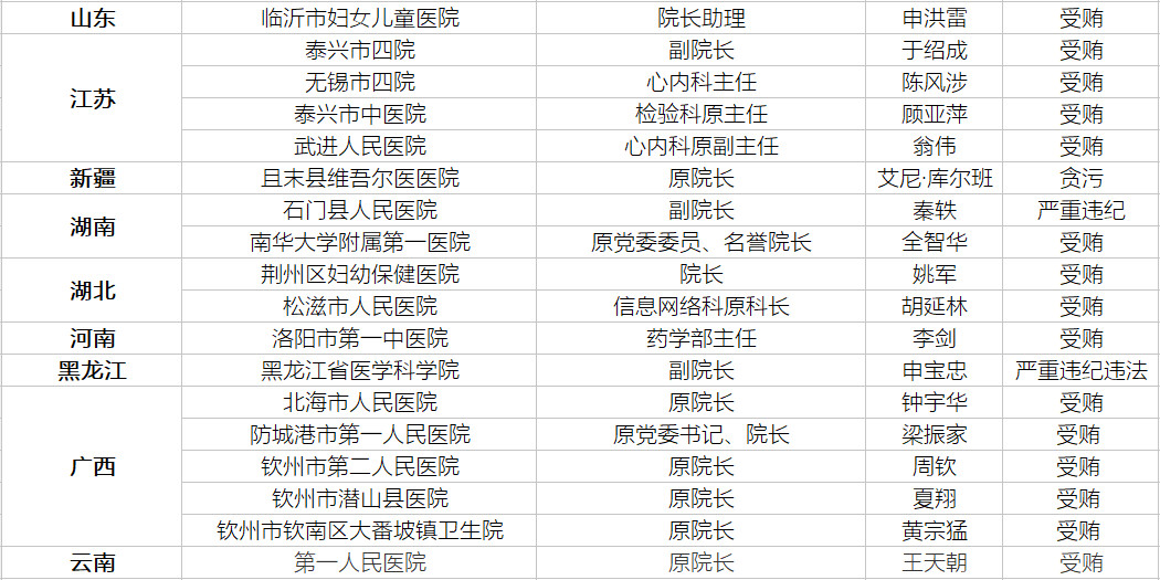 不難從上述表格與文字中看出,縣級以上醫院受賄案的涉及者則廣泛得多,上至院長、下至科室主任乃至普通醫生、藥劑師等,均有涉案。種種跡象表明,采購藥品器械要收回扣,醫院建樓也要撈一筆,已經成了在醫院內部大行其道的“潛規則”。伴隨著藥品器械采購領域的“游戲規則”,醫院“拔出蘿卜帶出泥”的貪腐也屢見不鮮。