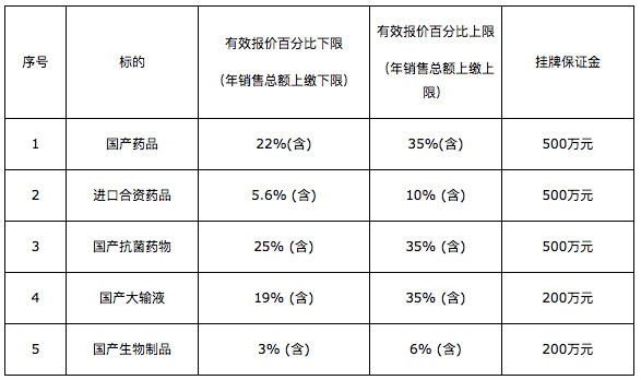 公告要求,將根據(jù)藥品當(dāng)年銷售總額,按照藥品類別設(shè)定了不同的“有效報(bào)價(jià)百分比”。5個(gè)類別報(bào)價(jià)百分比的下限分別為3%~25%,上限分別為6%~35%。此外,還需繳納高額的掛牌保證金。(見下表)