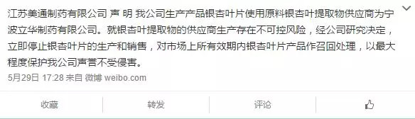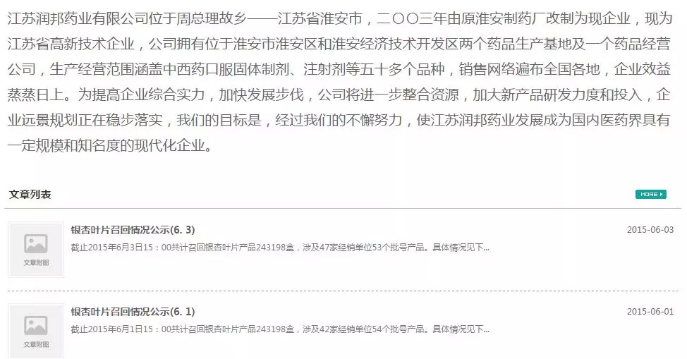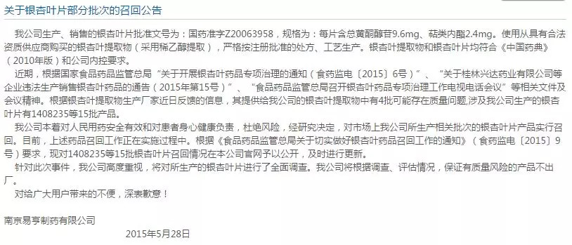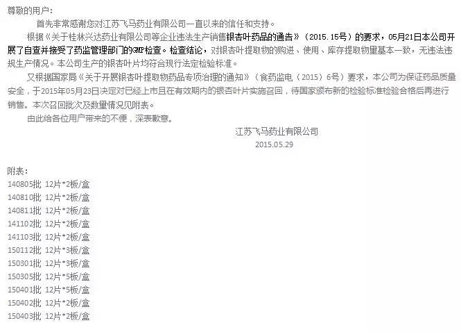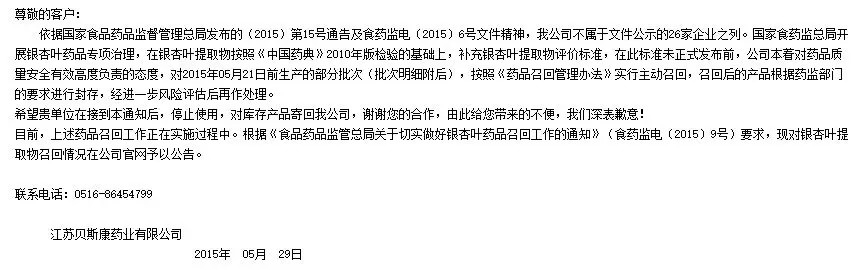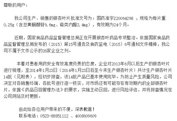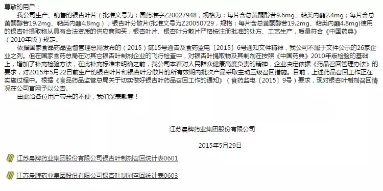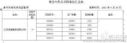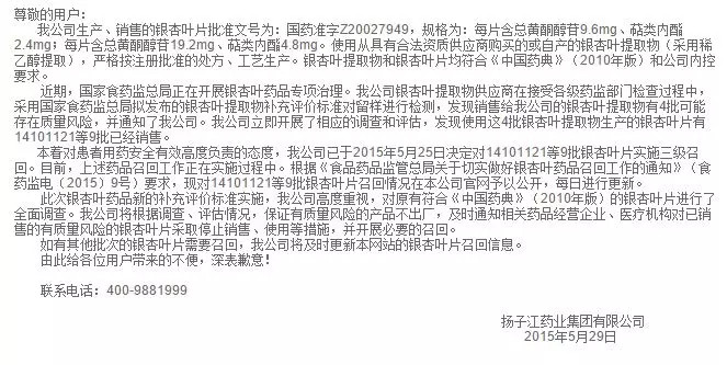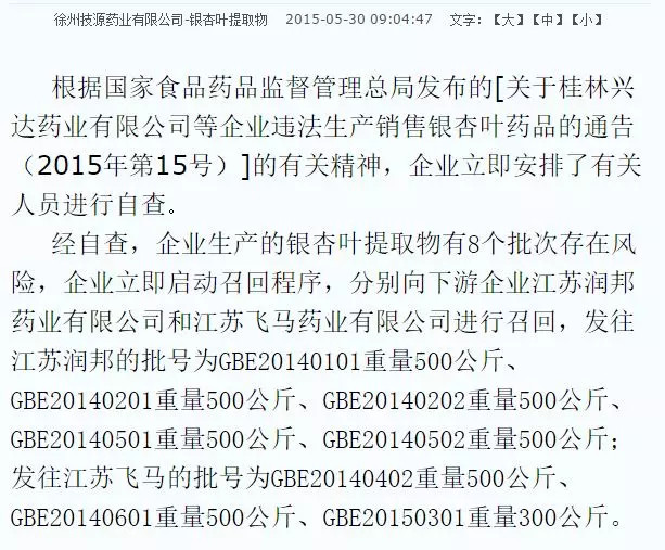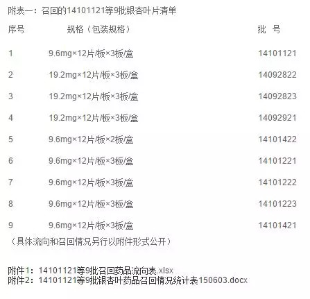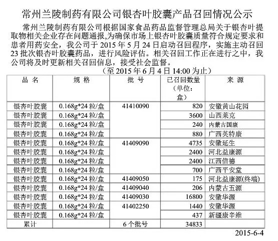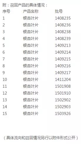 6月4日,根據國家總局要求,江蘇藥品生產企業已開展銀杏葉藥品的召回工作,江蘇藥監局公布了該省11家藥企涉銀杏葉藥品召回情況。有關情況如下: