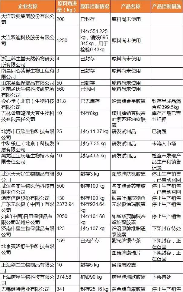 會(huì)心堂(北京)生物科技有限公司、吉林省雁鳴湖大豆生物科技有限責(zé)任公司、北海市巨欣生物科技有限公司、中科樂仁(北京)科技發(fā)展有限公司、黑龍江寶慶隆生物技術(shù)有限責(zé)任公司等5家企業(yè)購買的原料已投入生產(chǎn),但產(chǎn)品未流入市場。