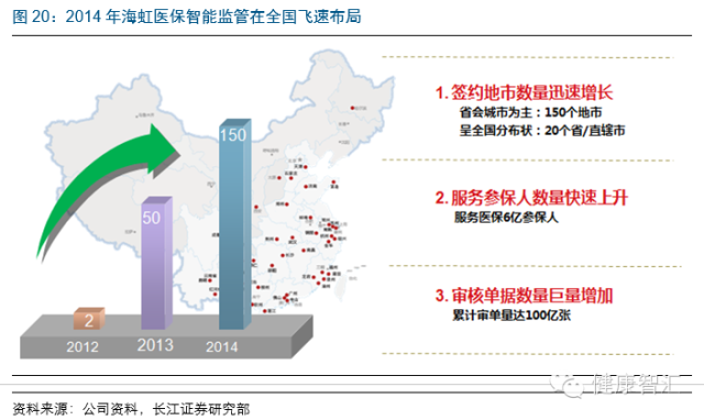 “湛江模式”在醫(yī)?;鸸芾砟J降耐黄?,是海虹大健康生態(tài)圈進(jìn)程中的重要里程碑,其內(nèi)涵包括:1、智能審核控費(fèi)和支付評審,湛江社?;饘⒁院:绲脑露葘徍私Y(jié)算數(shù)據(jù)為參考指標(biāo),進(jìn)行費(fèi)用的核定和撥付,并與醫(yī)院進(jìn)行核查、分析、評審;2、醫(yī)保大數(shù)據(jù)分析,提供基金科學(xué)管理的決策支持;3、建立醫(yī)保支付價(jià)格庫和評價(jià)體系,基于1999年開始在藥品、耗材招標(biāo)采購價(jià)格知識庫的積累,建立藥企、醫(yī)院、醫(yī)保之間的定價(jià)機(jī)制和醫(yī)療服務(wù)質(zhì)量的評價(jià)體系;4、藥品器械集中采購(GPO),掌握了代表醫(yī)保向上游藥企議價(jià)的權(quán)利,極大利好公司醫(yī)藥電商業(yè)務(wù)的開展;5、建立個(gè)人健康檔案,參保人可實(shí)現(xiàn)基于移動(dòng)APP進(jìn)行歷史健康數(shù)據(jù)的查詢,并為其提供綜合性醫(yī)療健康落地服務(wù)等。