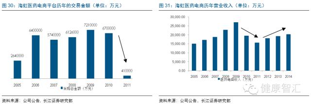 2010年以前海虹的醫(yī)藥電商年度交易額及營收規(guī)模保持穩(wěn)步增長,而由于2010年受國家藥品招投標(biāo)改革政策的影響,海虹醫(yī)藥電商交易平臺陸續(xù)被地方政府買斷遷移,因此營業(yè)收入出現(xiàn)萎縮。后續(xù)在地方政府鼓勵(lì)醫(yī)藥電商的政策支持下,公司已向全面的即時(shí)電子商務(wù)模式轉(zhuǎn)變,電商業(yè)務(wù)的交易總額與營業(yè)收入也呈現(xiàn)穩(wěn)步增長態(tài)勢。
