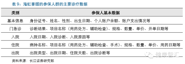 第二、PBM系統(tǒng)審核的患者診療記錄。只要患者需要醫(yī)保報(bào)銷、醫(yī)保局需要使用PBM系統(tǒng)鑒定診療行為的合理性,醫(yī)院均需要將患者的診療數(shù)據(jù)上傳到PBM系統(tǒng)。通過該渠道,海虹可掌握8億參保人群從門診到住院、出院整個(gè)醫(yī)療過程中的檢查、診斷、用藥、手術(shù)等所有診療數(shù)據(jù)。