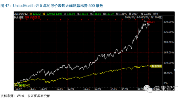 通過分析海虹控股的商業(yè)模式,我們認(rèn)為,海虹的PBM+TPA業(yè)務(wù)格局對標(biāo)的應(yīng)是ESI(快捷藥方)+UnitedHealth(聯(lián)合健康)的結(jié)合體。聯(lián)合健康是一家多元化的健康福利機(jī)構(gòu),為美國50個(gè)州、超過8500萬的人提供健康保險(xiǎn)和服務(wù),業(yè)務(wù)覆蓋范圍超過125個(gè)國家,市值突破1120億美元.。