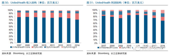 +TMT公司”的架構(gòu),旗下包括兩大平臺,即UnitedHealthcare和Optum,前者屬于保險(xiǎn)業(yè)務(wù),2014年收入占比71.3%,后者又分為三個(gè)平臺分別提供慢性病管理(健康管理)、醫(yī)療軟件信息咨詢(TMT)和藥房福利配送服務(wù)(PBM)。