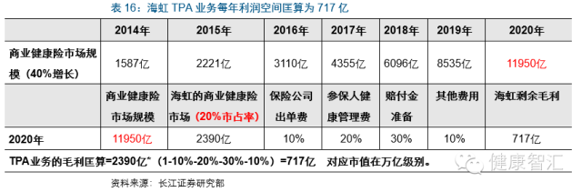 TPA業(yè)務(wù)顛覆傳統(tǒng)核保核賠獲得分成的模式,而是在慢病險(xiǎn)種領(lǐng)域占據(jù)主場地位,至2020年毛利空間達(dá)百億級別,對應(yīng)市值在萬億級別:我們認(rèn)為,政府鼓勵(lì)商業(yè)健康險(xiǎn)發(fā)展的核心動(dòng)力是增加商保的支付比例,若僅按現(xiàn)有模式針對健康人群發(fā)布產(chǎn)品,永遠(yuǎn)無法達(dá)到為醫(yī)保分憂的目標(biāo)。因此,海虹針對慢病人群的商業(yè)健康險(xiǎn)具有巨大的政策支持力度和市場空間。未來5年商業(yè)健康險(xiǎn)市場規(guī)模達(dá)到萬億已是市場共識,假設(shè)我國商業(yè)健康險(xiǎn)未來以年均40%增長,我們預(yù)計(jì)海虹控股有能力占據(jù)20%的市場份額,2020年海虹有望占據(jù)2390億保費(fèi)收入。再假設(shè)保險(xiǎn)公司分得10%的出單通道費(fèi)、對參保人的管理費(fèi)用約20%,并扣除30%的賠付金準(zhǔn)備、10%的人工和系統(tǒng)等其他費(fèi)用,則海虹剩余毛利為717億元,對應(yīng)市值則在萬億級別。