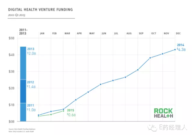 2014年,互聯網醫療是破紀錄的一年,交易總額超過40億美元,橫壓2013年兩倍之多,且是前三年的金額總和,可見市場熱錢涌動,大行業趨勢明顯。然2015年整體態勢現在還難下論斷,但第一季度統計數據已出,風險投資互聯網醫療領域的金額超過6.3億美元。在2015年第一季度互聯網醫療的投資領域中,排名前6的投資項目總金額占據61%,即3.73億美元,其金額由高到低分別是,大數據分析、醫療健康消費、EHR及診斷流程、數字化診斷、人口健康管理、互聯網醫療設備。